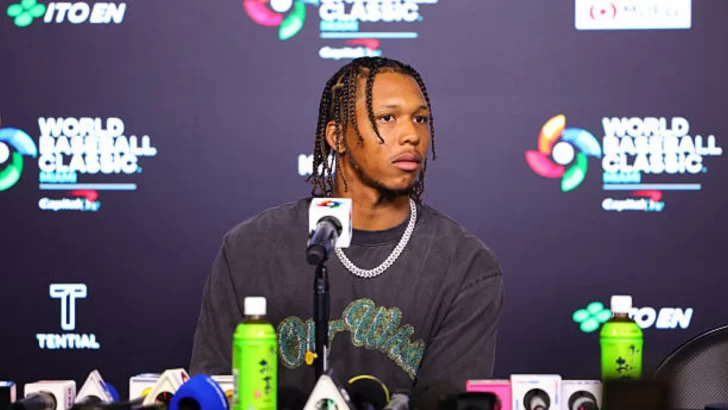 Brayan Bello #66 de República Dominicana habla en conferencia de prensa tras ganar el partido del Grupo D del Clásico Mundial de Béisbol 2026 presentado por Capital One entre República Dominicana e Israel en el LoanDepot Park el lunes 9 de marzo de 2026 en Miami, Florida. (Foto de Kelly Gavin/WBCI/MLB Photos vía Getty Images)