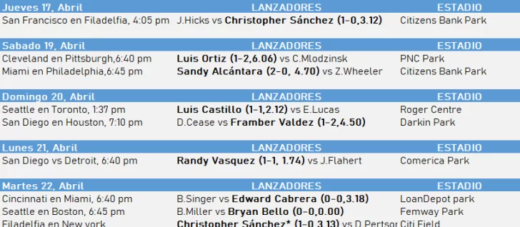 Y el domingo seis de abril,Sandy Alcántara, de los Marlins en Atlanta; Cristopher Sánchez de los Phillies vs Angels; Ronel Blanco, de los Astros en Minnesota y Luis Ortiz, de los Angels recibiendo a Cleveland.